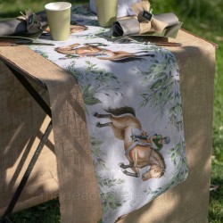 Chemin de table en toile avec mention "vive les mariés" aux couleurs douces et tendances. Dimensions : 4 m x 28 cm