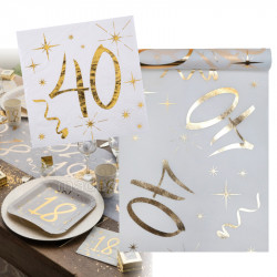 Chemin de table anniversaire 40 ans, chemin de table anniversaire noir imprimé 40 ans en rouleau de 5 m sur 0.30 cm, parfait pour 2 tables rectangles de 2 m ou pour 3 tables rondes de 160 cm de diam max.