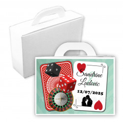 Boîte dragées valise pour offrir à vos invités lors d'un mariage thème moto, avec motifs deux motos et coeur. Dragées non comprises. Vendue à l'unité. Dimensions de la boîte : 7,5 cm x 6 cm x 2 cm. Contenance : 60 g (ou 10 dragées environ).