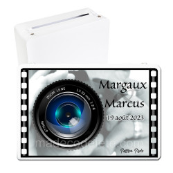Urne pour un événement sur le thème de la photographie... vendue personnalisée (prénoms et date). Matière : cartonnée. Convient pour un événement jusqu'à cinquante personnes. Dimension : 24 cm x 16 cm x 10 cm.