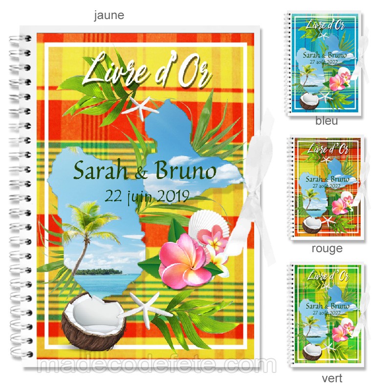 Livre d'or personnalisé avec prénoms des mariés sur le thème du madras, Antilles, tropical, souvenir vacance en Guadeloupe. Possibilité d'insertion de photo (invité(s) d'honneur(s) uniquement). Le livre d'or madras Guadeloupe est livré en format portrait.