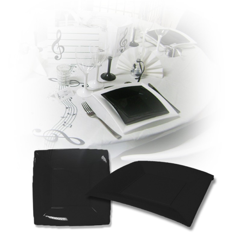 Assiette design noire légèrement incurvée pour toutes réceptions. Qualité ++ pour ces assiettes réutilisables, micro-ondulables, lavables en lave-vaisselle et passages freezer). Matière : polypropylène thermorétracté (résistance accrue aux chocs et aux températures) Vendue à l'unité. Dimensions : 18 x 18 cm