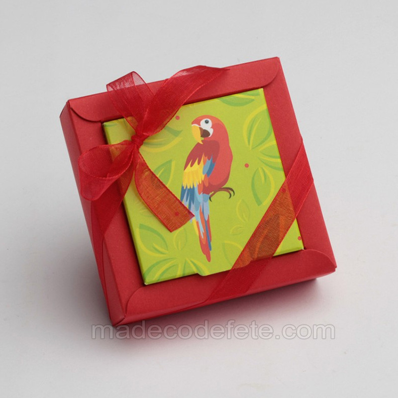 Boite à dragées rouge exotique motif perroquet. Cette boîte vous permettra d'offrir à vos invités un souvenir de votre événement. Dimensions : 8,5 cm x 8,5 cm x 2,5 cm. Vendue sans dragées. Ruban non compris. Contenance : environ 65 g. Vendue à l'unité, montée, prête à l'emploi.