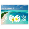 Pour votre choix de vaisselle jetable, le côté transparent sera idéal ici pour créer l'ambiance souhaitée. Nous retrouverons également à proximité de ce set de table, la serviette avec un beau pliage en forme de feuille des îles avec une fleur exotique, un porte nom palmier, contenant dragées palmier, quelques petites décos à parsemer comme perles de pluie bleu turquoise et coquillages finaliseront le tout.