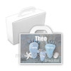 Nous avons souhaités un décor unique et original pour cette nouvelle gamme décorations pour un baptême en 2020. Pour cette nouvelle gamme baptême, de petits pîeds seront les motifs principaux. Que ce soit pour le faire-part baptême, le menu déco pour la table, nous retrouverons ces motifs rigolots sur le carton de remerciement, l'invitation au repas, le marque place chevalet et sur la petite valise à dragées baptême.