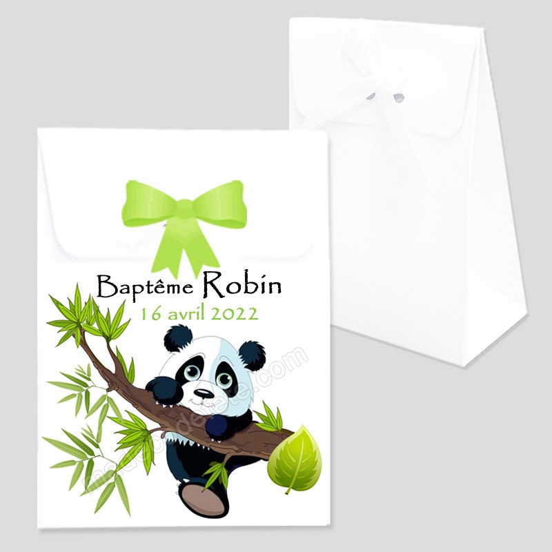 Pochon à dragées motifs petit panda et feuilles de bambou, idéale pour fêter le baptême de votre enfant sur le thème panda. A fermer avec un ruban de la couleur de votre choix (ruban et dragées non fournis). Cette boîte dragées sera à garnir avec vos dragées. Vendu personnalisé. Dimensions : 9 cm x 6,5 cm.