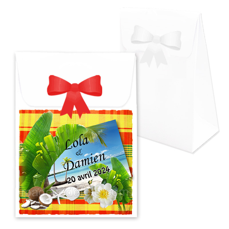Pochon dragées thème exotique et madras jaune avec carte postale plage des îles. A fermer avec un ruban après avoir inséré vos dragées (ruban et dragées non fournis). Vendu personnalisé. Contenance : 60 g (une dizaine de dragées) Dimensions : 9 cm x 6,5 cm