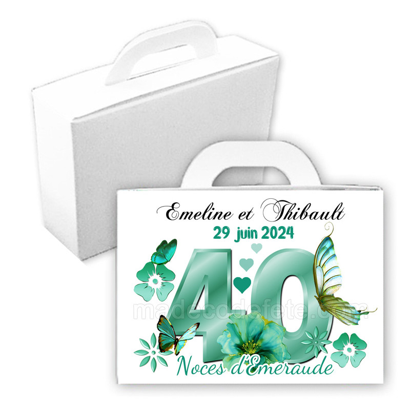 Boîte à chocolats 40 ans noces d'émeraude motifs chiffre 40, fleurs, coeurs, papillons et ruban émeraude pour offir à vos invités. Cette boîte est personnalisée avec votre texte (prénoms, date, ou autre mention). Chocolats non compris. Se ferme facilement grâce à sa fonction clipsable à l'arrière. Dimensions : 12 cm (ht) x 9 cm (larg.) x 4,5 cm (prof....