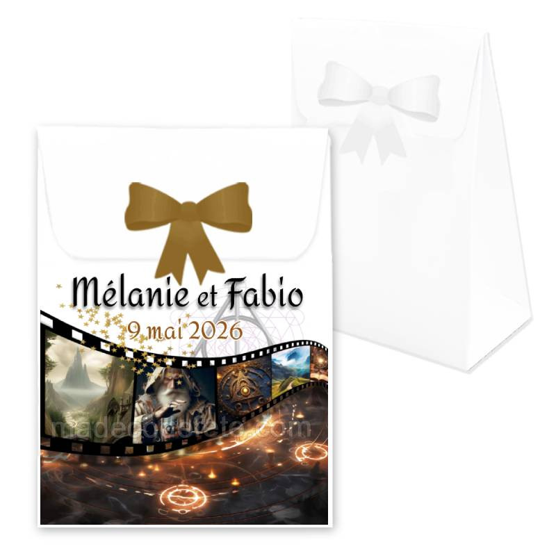 Boîte à dragées Magie et Légende, parfait pour les fêtes à thème cinéma et films tels que "le Seigneur des Anneaux", "Excalibur", "Game of Trones", etc..., avec personnalisation prénoms et date d'événement. A fermer avec un petit ruban après avoir insérer vos dragées (ruban et dragées non fournis). Contenance : 40 à 60 g. Dimensions : 9 cm x 6,5 cm
