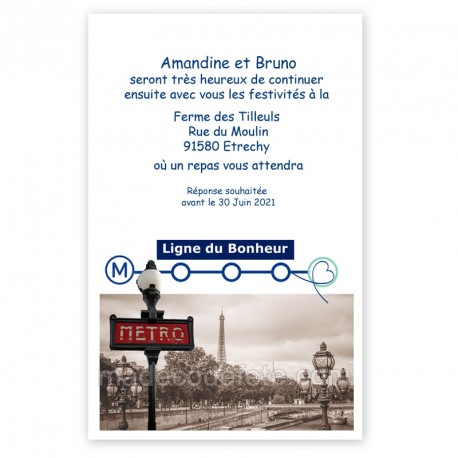 Cet encart invitation sur le thème déco de Paris et de son métro sera à glisser dans le faire-part d'invitation. Il vous permettra de sélectionner certains de vos invités qui resteront ensuite au repas. Il est vendu imprimé par nos soins