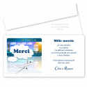 Remerciement carton motifs billet d'avion, nuages et avion, thème du voyage pour remercier vos invités de leur présence à votre événement, livré avec enveloppe blanche fermeture bande adhésive. Vendu à l'unité imprimé par nos soins Vos données sont à nous adresser via le formulaire ci-dessous. Dimensions 20 cm x 10 cm.