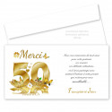 Carton de remerciement 50 ans de mariage Noces d'Or livré avec enveloppe. Vendu à l'unité imprimé par nos soins Vos données sont à nous adresser via le formulaire ci-dessous (mise en page par notre service carterie avec visuel adressé par mail pour accord ou modifications si besoin, après validation de commande). Dimensions : 20 x 10 cm. Livré avec enveloppe