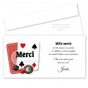 Carton de remerciement thème jeux et casino pour vous permettre d'adresser un message à vos invités pour les remercier de leur présence à votre événement. Il est livré avec enveloppe blanche, personnalisé avec votre texte de remerciement (prototype fourni pour validation avant impression)