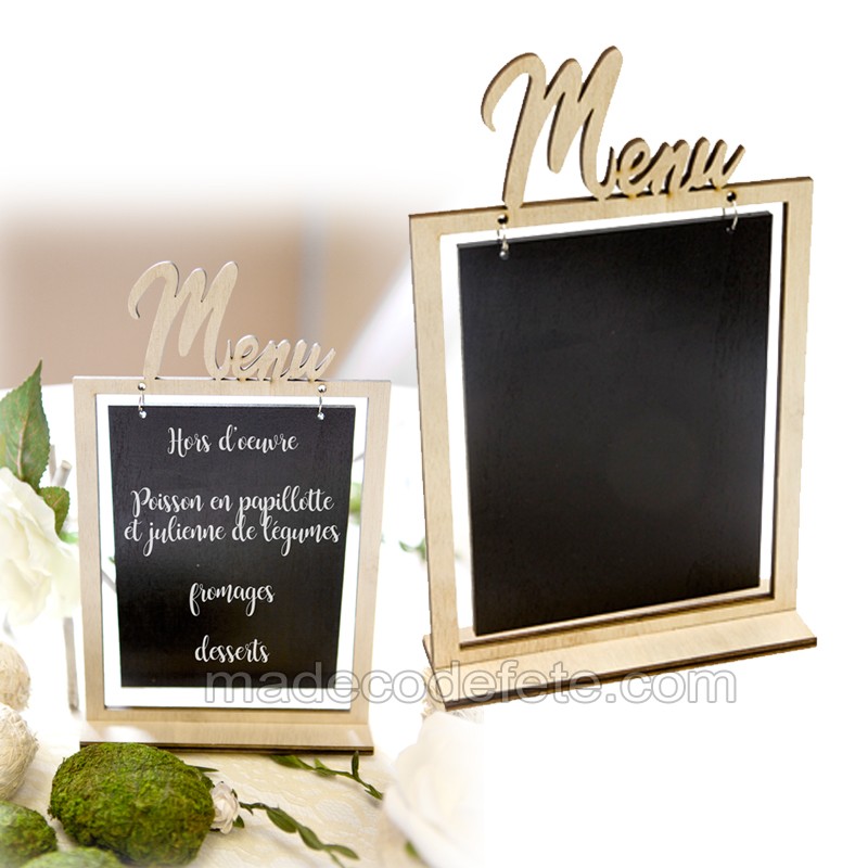 Joli menu bois et ardoise avec mention "menu" au dessus pour centre de table et pour tous vos thèmes. Ce menu pourra être customisé avec les décorations en harmonie avec votre thème. Vous pourrez inscrire le menu sur l'ardoise ou poser dessus une carte menu imprimée. Matière : bois, ardoise. Dimensions : 23 cm x 14 cm