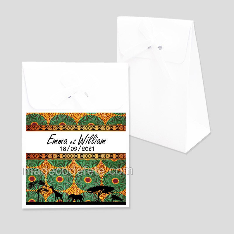 Ballotin contenant dragées de mariage sur le thème Africa wax orangé. Vendu avec personnalisation des prénoms des invités d'honneur, date d'événement. Boîte à dragées ethnique à fermer avec ruban (ruban et dragées non fournis). Contenance 10 dragées et plus Dimensions : 9 cm x 6,5 cm