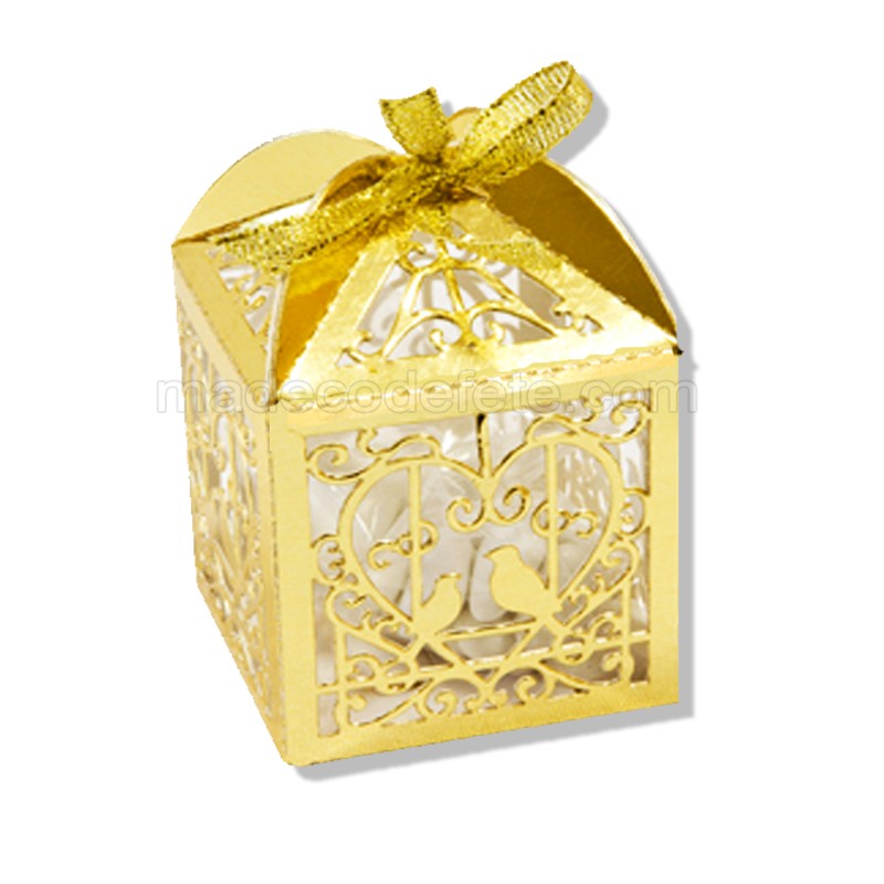 Boîte à dragées or ajourée avec motifs coeur et oiseaux, parfaites pour un mariage, un anniversaire de mariage de noces d'or, ou pour un anniversaire, une communion, un baptême. Cette boîte dragées or sera un joli souvenir de votre événement. Vendues en lot de 10 boîtes (sans ruban). Matière : cartonnée or métallisée. Dimension : 7,5 cm x 5 cm.