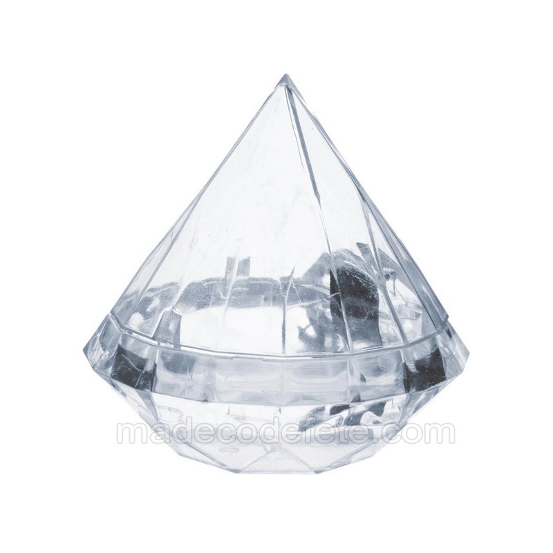 Diamant en plexi transparent pour une idée de dragées et cadeau dragees pour un mariage et fêtes, un contenant dragées forme de diamant original, contenant pas cher en plexi transparent de 7 cm, parfait comme cadeau dragées pour vos invités ou pour une déco thème de la richesse ou des pierres précieuses. contenantce 10 dragées ou plus