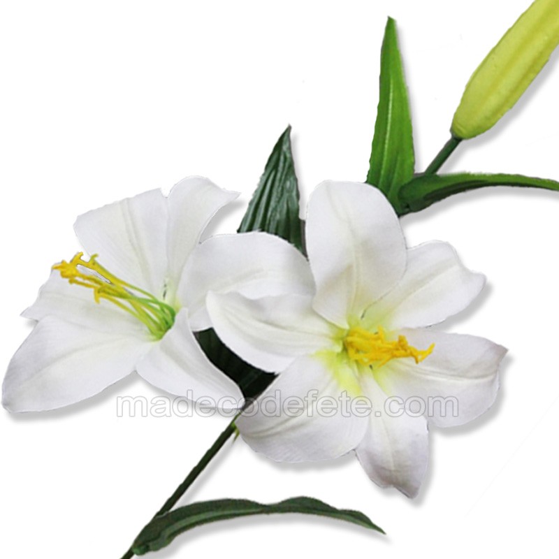 Branche de deux fleurs de lys blancs avec bouton, aspect naturel, pour toutes décorations florales. Ces jolies fleurs de lys blancs pourront être disposées dans une coupe, un vase, un photophore ou à même vos tables et votre buffet. Matière : artificiel qualité ++. Dimensions : 66 cm de long. Fleur : 12 cm