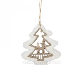 Joli sapin pour une déco de Noël avec contour fourrure blanche et motif intérieur or pailleté, à poser sur votre table de noël ou à suspendre. Matière bois et fourrure synthétique. Dimensions du sapin : 14 cm x 12 cm.