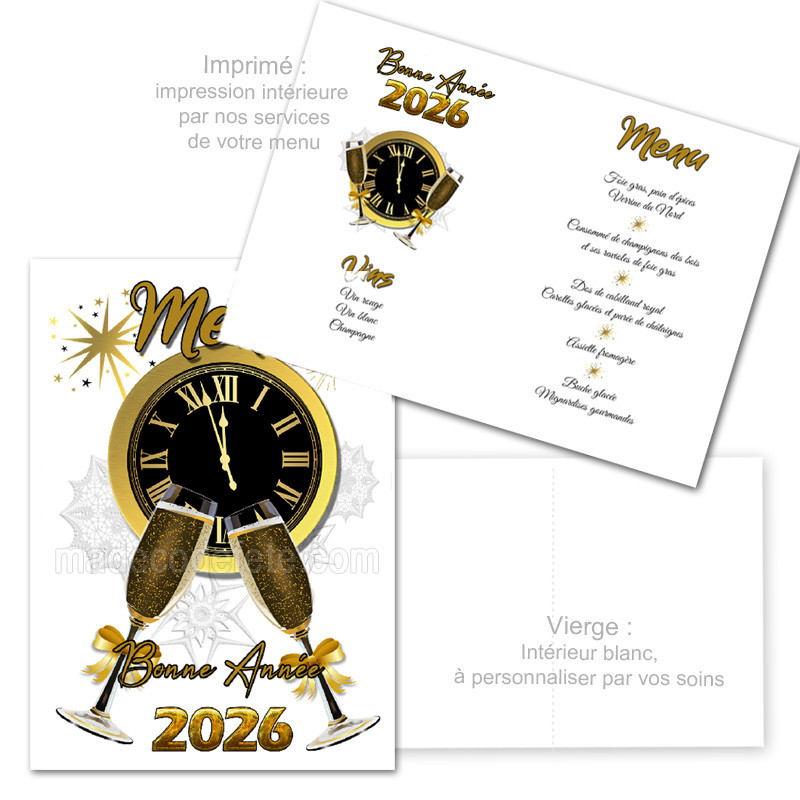 Menu pour fête de fin d'année mention bonne année 2026, motifs horloge minuit, coupes de champage, feux d'artifices. Ce menu pourra être posé devant chaque invité lors de votre fête du Nouvel An 2026. Dimensions : fermé : 15 cm x 10,5 cm - ouvert : 15 cm x 21 cm. Ce menu est vendu personnalisé avec votre menu ou vierge (motifs seuls) pour être personnalisé par vos soins