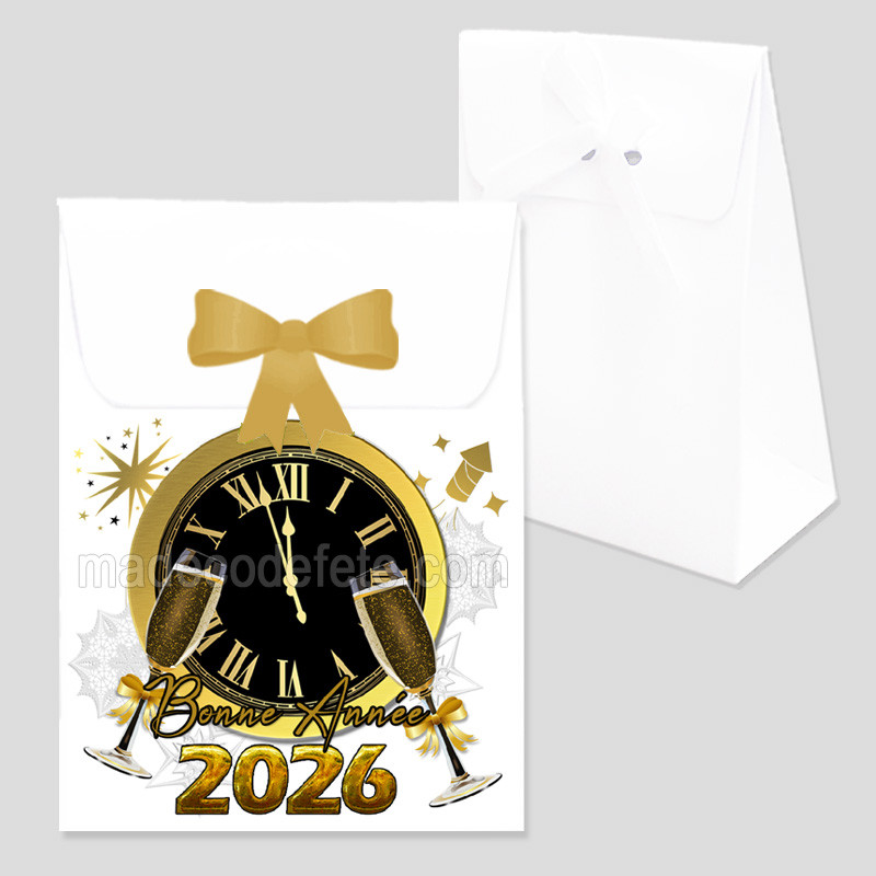 Boîte cadeau invité pour le Nouvel An, mention 2026 à offrir à vos invités lors de votre réveillon du Nouvel An. Vous pourrez insérer à l'intérieur des petits chocolats ou toutes autres friandises. A fermer avec un ruban de la couleur de votre choix (ruban et chocolats non fournis avec la boîte). Contenance : 60 g. Dimensions : 9 cm x 6,5 cm.