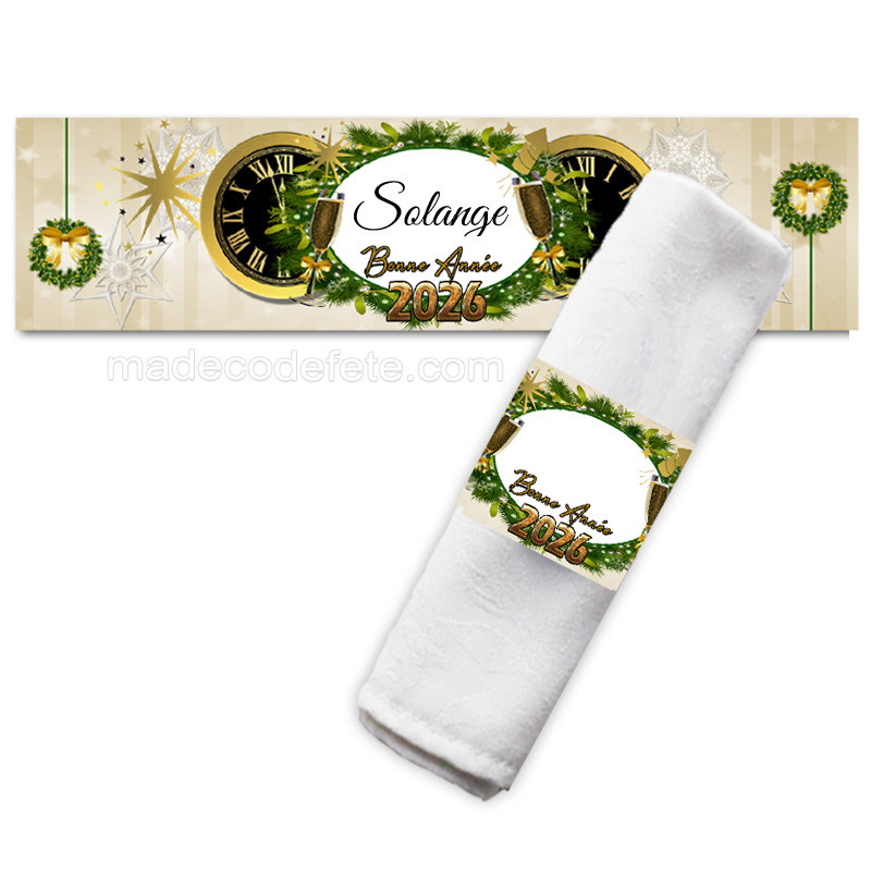Porte-serviette bonne année 2026 avec motifs horloge minuit, couronne de feuilles, coupes de champages, feux d'artifices pour une présentation de table originale. Rond de serviette personnalisé ou non pour orner vos tables de réveillon de Nouvelle Année 2026