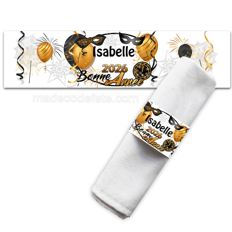 Porte-serviette bonne année 2026 avec motifs horloge minuit, couronne de feuilles, coupes de champages, feux d'artifices pour une présentation de table originale. Rond de serviette personnalisé ou non pour orner vos tables de réveillon de Nouvelle Année 2026