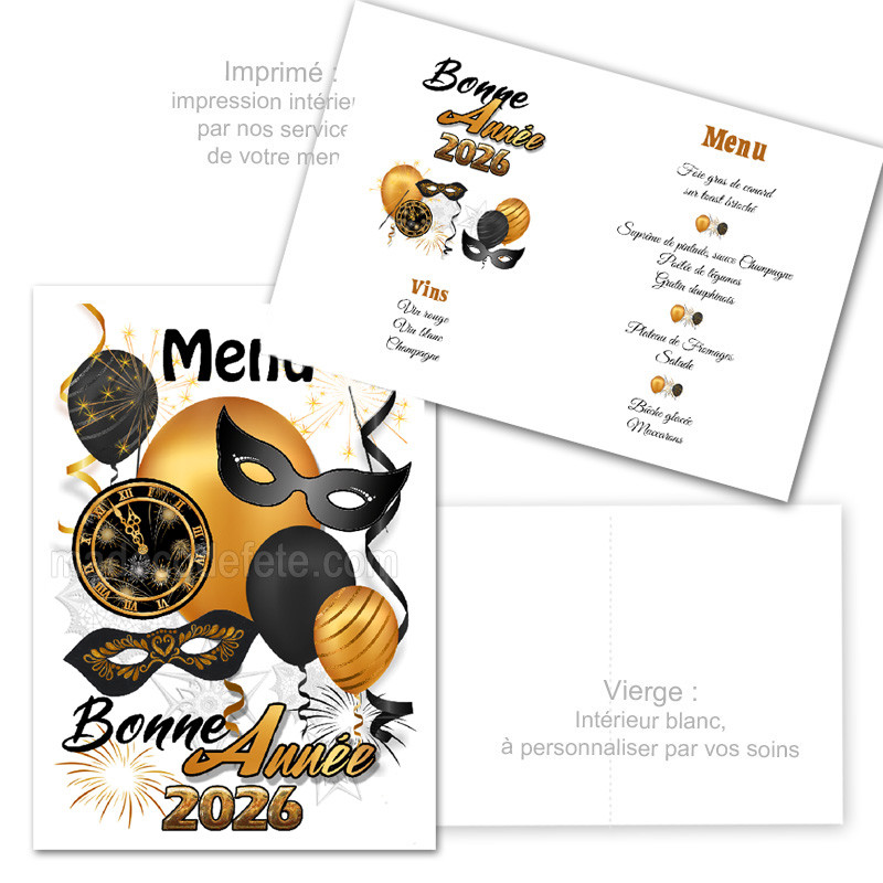 Menu pour fête de fin d'année mention bonne année 2026, motifs horloge minuit, coupes de champage, feux d'artifices. Ce menu pourra être posé devant chaque invité lors de votre fête du Nouvel An 2026. Dimensions : fermé : 15 cm x 10,5 cm - ouvert : 15 cm x 21 cm. Ce menu est vendu personnalisé avec votre menu ou vierge (motifs seuls) pour être personnalisé par vos soins