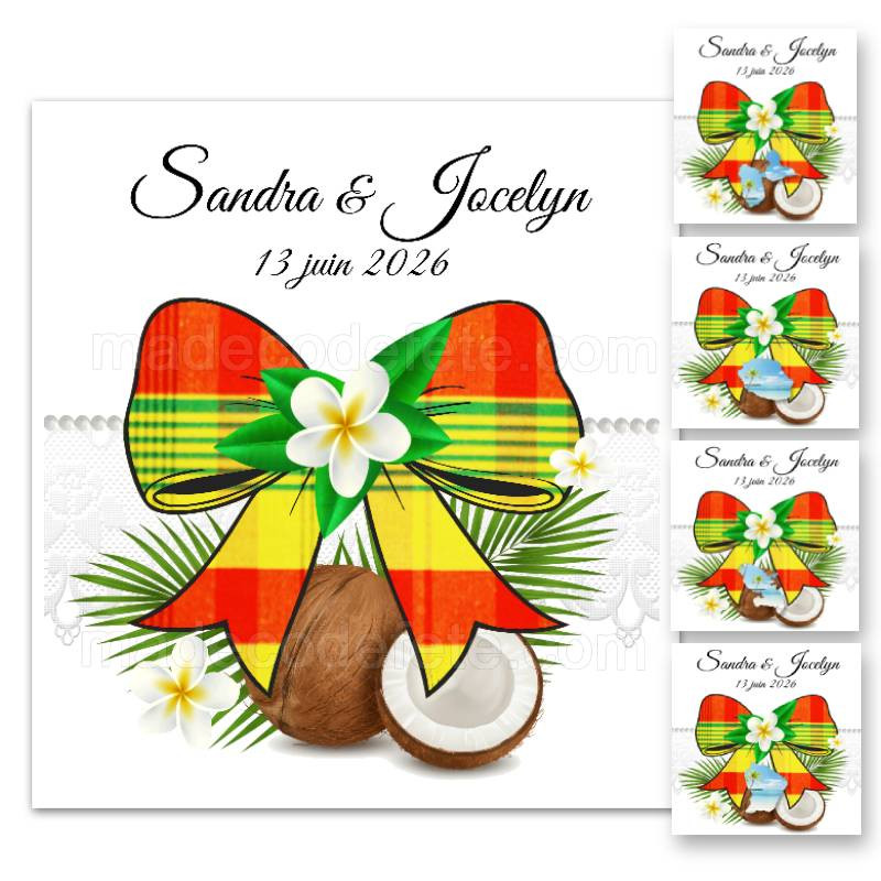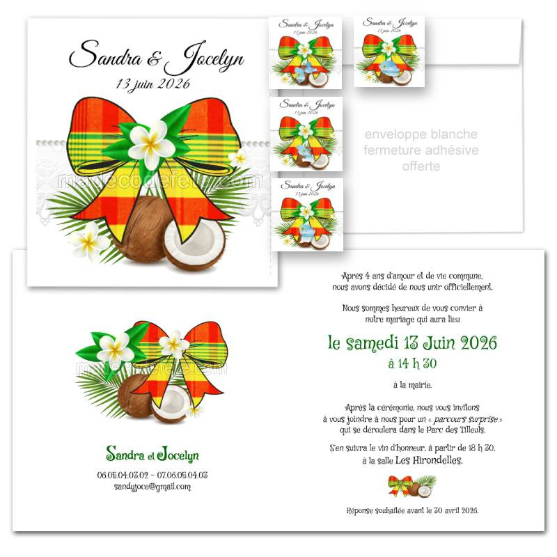 Faire-part noeud madras jaune motifs exotiques fleurs monoi, noix de coco, ruban dentelle, perles et noeud madras jaune, avec option cartes Dom-Tom. Invitez vos proches dans une ambiance antillaise pleine de punch et de couleurs. Dimensions : 15 x 16 cm fermé - 30 x 16 cm ouvert. Livré personnalisé, enveloppe blanche offerte.