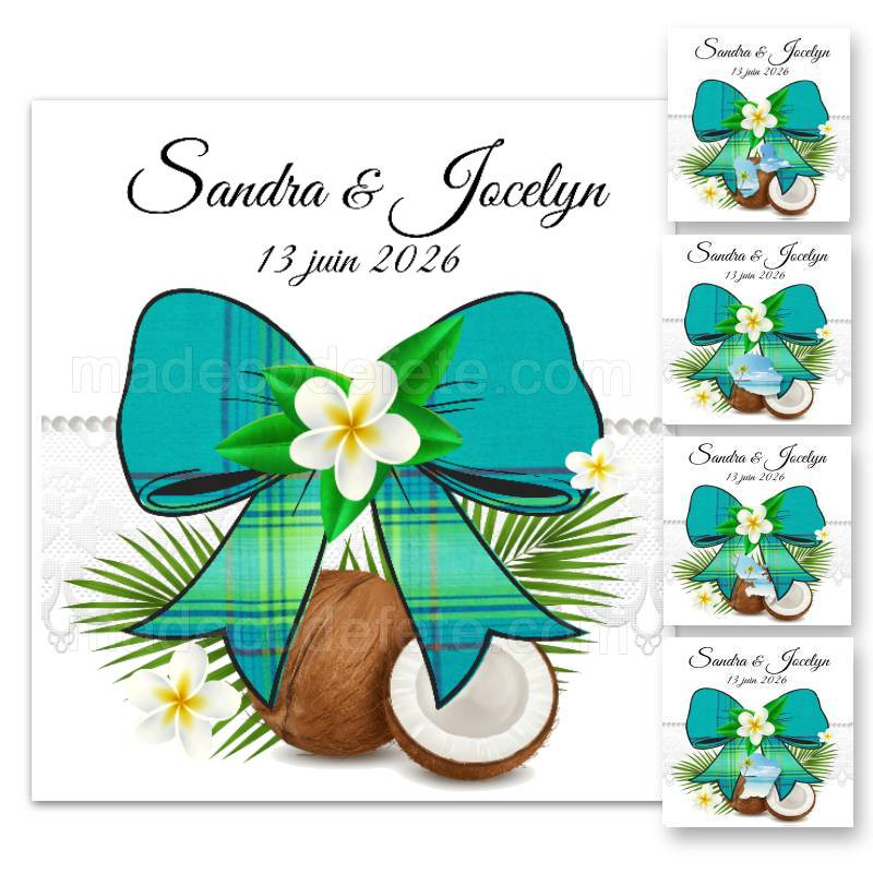 Carton de remerciement motifs exotiques fleurs monoi, noix de coco, ruban dentelle, perles et noeud madras bleu, avec option cartes Dom-Tom... Ce remerciement est aussi dérivé en : faire-part, menu, porte-nom, porte-serviettes et boîtes à dragées. Livré avec enveloppe. Vendu à l'unité, personnalisé par nos soins Vos données sont à nous adresser via le...