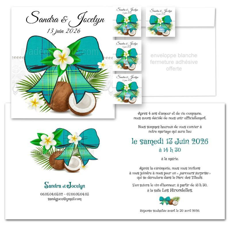 Faire-part noeud madras bleu motifs exotiques fleurs monoi, noix de coco, ruban dentelle, perles et noeud madras bleu , avec option cartes Dom-Tom. Invitez vos proches dans une ambiance antillaise pleine de punch et de couleurs. Dimensions : 15 x 16 cm fermé - 30 x 16 cm ouvert. Livré personnalisé, enveloppe blanche offerte.