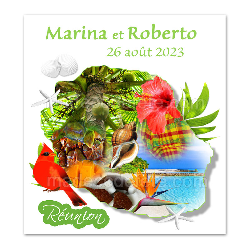 Le faire-part île de la Réunion vous permettra de préparer votre fête en l'honneur de votre île. Haute en couleurs locales, le faire-part île Réunion avec son oiseau cardinal ravira vos invités.
