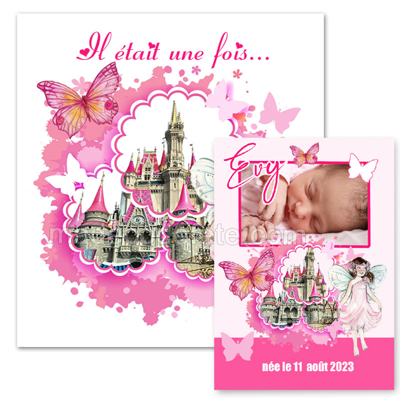 Faire-part de naissance avec motifs féériques : château de princesse et petite fée pour annoncer avec douceur l'arrivée de votre enfant. Vendu avec encart reprenant les motifs du thème et photo de votre enfant. Dimensions : Faire-part : 15 x 16 cm fermé - 30 x 16 cm ouvert. Encart photo : 14 cm x 10 cm. Enveloppe blanche fermeture adhésive offerte.
