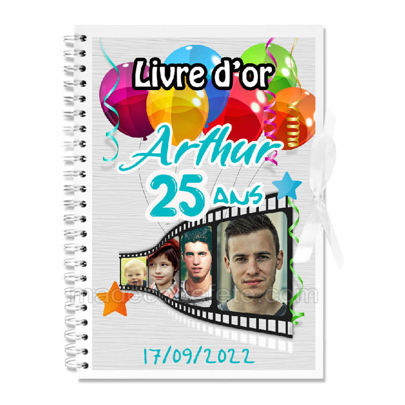 Livre d'or anniversaire ÂGES personnalisables, motifs couleurs. Livré avec personnalisation de vos textes, photos personnelles possibles (si photos souhaitées : 3 ou 4 photos impératives) (prototype avant impression). Dimensions : 30 cm x 21 cm. Se ferme avec un joli ruban satiné blanc. Contient 40 feuillets (80 recto/verso) en beau papier mat qualité 140 g/m2