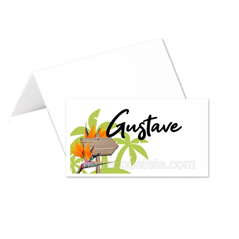 Porte-noms avec motif exotique pour une fête déco avec fleurs de strelitzia