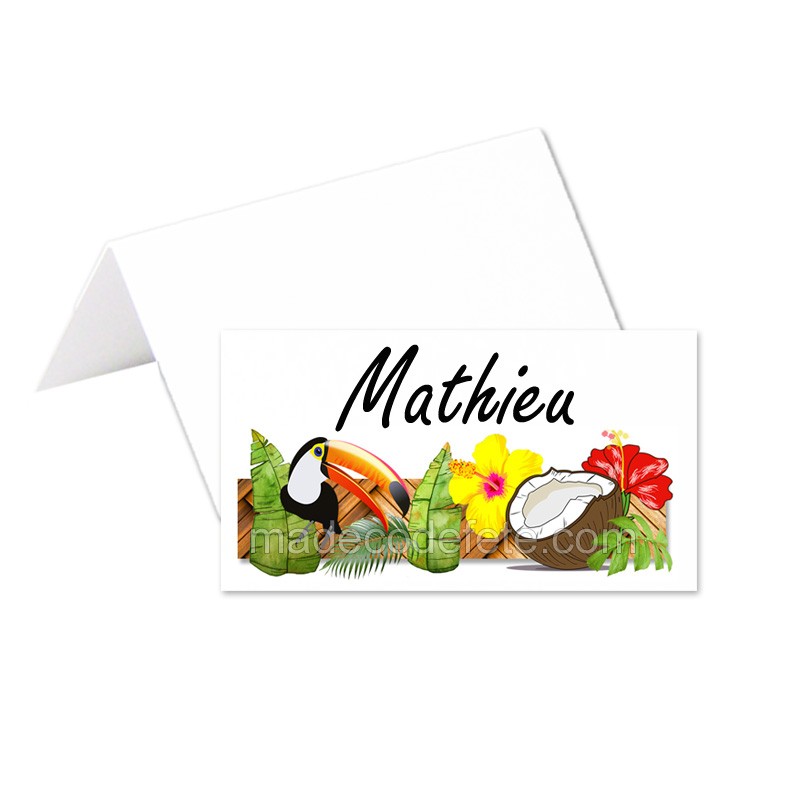 Porte-noms motif toucan, feuilles bananier sur fond osier à poser sur vos tables pour le placement des invités lors d'un anniversaire, mariage ou toutes autres fêtes. Vendus avec les prénoms de vos invités ou vierges (motif seul) pour personnalisation par vos soins. Dimensions : Largeur : 7,5 cm - Hauteur (plié) : 3,5 cm. Vendus en lot de 24 porte-noms
