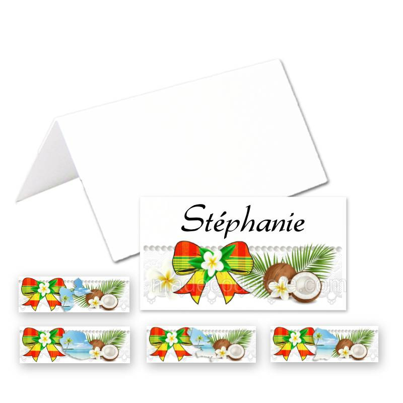 Les marque-places thème madras motifs exotiques fleurs monoi, noix de coco, ruban dentelle, perles et noeud madras jaune sont livrés en lot de 24 cartons chevalets blancs et 24 étiquettes adhésives (vierge ou imprimées avec vos prénoms) à coller sur le carton. Un délai est supplémentaire en cas d'option impression des prénoms par nos soins. Un délai est supplémentaire en cas d'option impression des prénoms par nos soins.