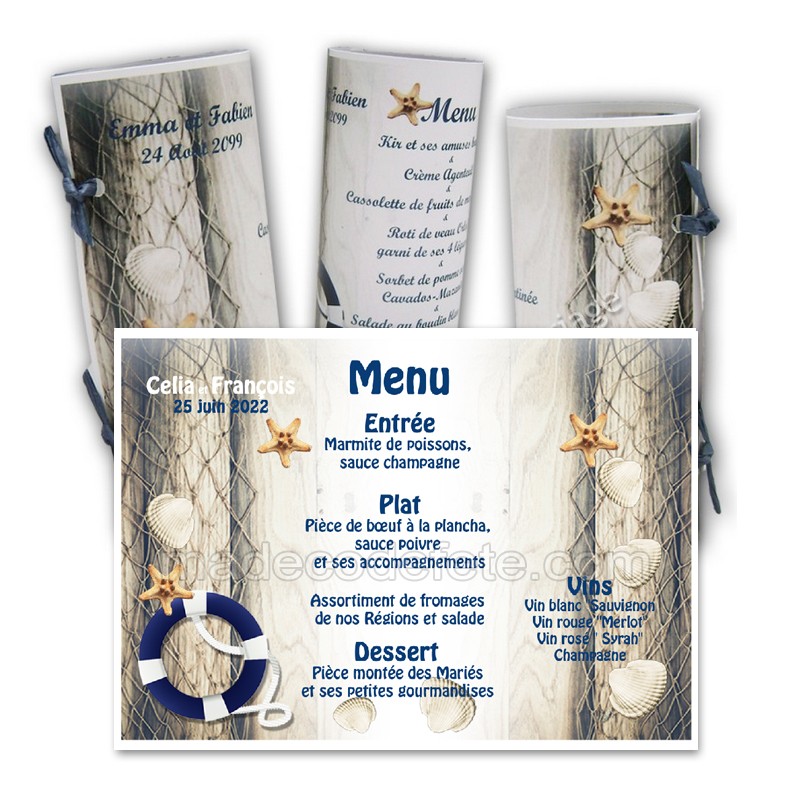 Le menu sur le thème de la mer avec son motif bouée marine est livré à plat avec deux trous de chaque côté pour passer un petit ruban permettant de former un cylindre.