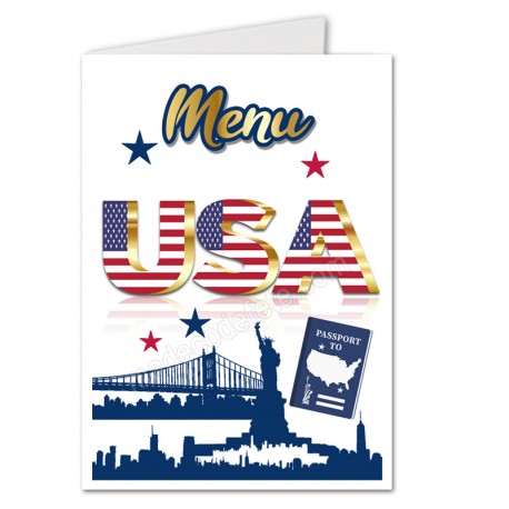 Menu pour événement sur thème USA, motif statue liberté, pont et buildings, passeport... Vendu à l'unité vierge (sans texte) ou personnalisé (avec votre texte menu) Ces textes seront à nous adresser via le formulaire disponible en cliquant sur l'option "produit personnalisé". Dimensions : Format fermé : 15 cm x 10,5 cm - Ouvert : 15 cm x 21 cm