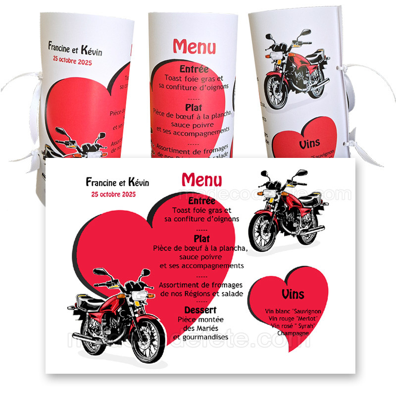 Menu sur le thème Moto avec motifs deux motos et deux coeurs, livré à plat avec deux trous de chaque côté pour passer un petit ruban permettant de former un cylindre. Vous pourrez ajouter au milieu une petite bougie led (non fournie avec le menu) qui, en soirée dans la pénombre de la salle, apportera une décoration lumineuse