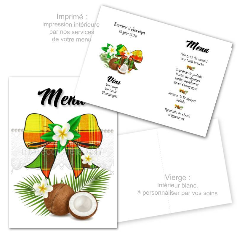 Menu pour tout événement motifs exotiques fleurs monoi, noix de coco, ruban dentelle, perles et noeud madras rouge, avec option cartes Dom-Tom. Vendu à l'unité vierge (sans texte) ou personnalisé (avec votre texte menu, en cliquant sur l'option "produit personnalisé". Dimensions : Format fermé : 15 cm x 10,5 cm - Ouvert : 15 cm x 21 cm