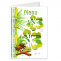 Menu madras vert fleur d'hibiscus, un menu au Format fermé : 15 cm x 10,5 cm - Ouvert : 15 cm x 21 cm, menu tropical vendu avec vos textes ou vierge pour être imprimé par vos soins, menu tendance à petit prix pour une déco antillaise à toutes fêtes et réceptions. prototype fourni avant la mise en impression finale.