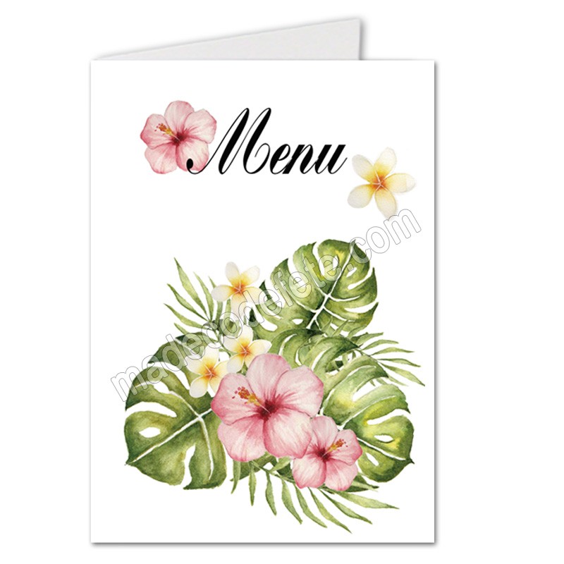Menu décoratif thème tropical pour créer de jolies tables tout en douceur sur le thème de l'exotisme. Associez le avec des feuilles philo et des coloris blanc et rose; Dimensions : fermé : 15 cm x 10,5 cm - ouvert : 15 cm x 21 cm Ce menu est vendu imprimé avec textes ou vierge (motifs seuls) pour être imprimé par vos soins