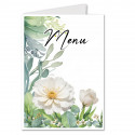 Menu thème nature et végétal, vendu personnalisé ou vierge (motifs seuls). Pour la personnalisation du menu, vos textes seront à nous adresser via le formulaire disponible en cliquant sur l'option "produit personnalisé". Dimensions : fermé : 15 cm x 10,5 cm - ouvert : 15 cm x 21 cm.