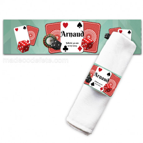Porte-serviettes thème déco jeux et casino. Cet article est un produit de carterie réalisé personnalisé ou non sur demande uniquement. Ni repris, ni échangé. Rond porte serviette personnalisé pour orner vos tables déco mariage, anniversaire et toutes fêtes. Pour une bonne visibilité, coloris des textes en noir uniquement et police de caractère appliquée selon modèle présenté. Merci de remplir soigneusement le formulaire et de remplir toutes les cases (aucune réclamation ne sera acceptée pour tout oubli de votre part)