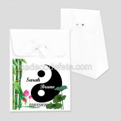 Pochon dragées déco zen Petit ballotin à dragées motif yin et yang idéal pour un thème zen avec motifs bambou, fleur de lotus rose fuchsia. Boîte à dragées petit prix à fermer avec un ruban après avoir inséré vos dragées (ruban et dragées non fournis). Vendu personnalisé. Contenance 10 dragées et plus Dimensions : 9 cm x 6,5 cm