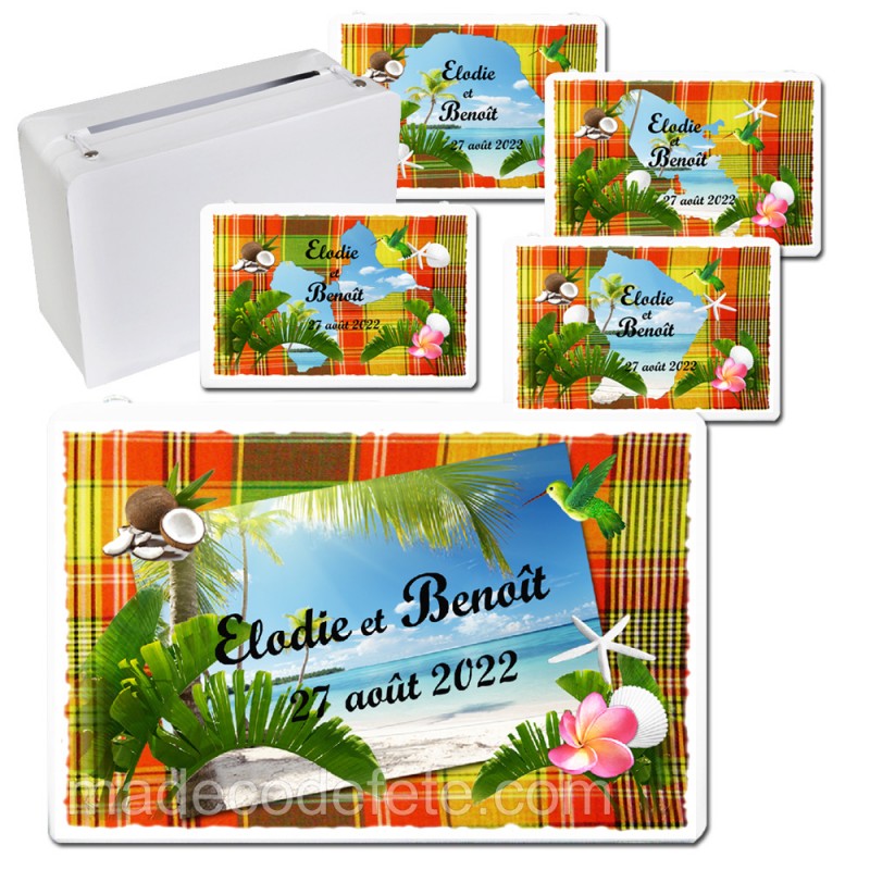 Urne pour tout événement thème Antilles et madras rouge avec carte postale ou carte Dom-Tom (guadeloupe, martinique, guyane, réunion). Vendue personnalisée (avec prénoms et date). Valise cartonnée jusqu'à cinquante personnes. Dimension : 24 cm x 16 cm x 10 cm.