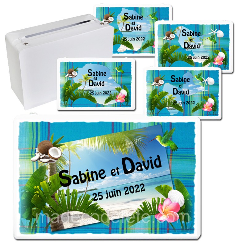 Urne pour tout événement thème Antilles et madras bleu avec carte postale ou carte Dom-Tom (guadeloupe, martinique, guyane, réunion). Vendue personnalisée (avec prénoms et date). Valise cartonnée jusqu'à cinquante personnes. Dimension : 24 cm x 16 cm x 10 cm.