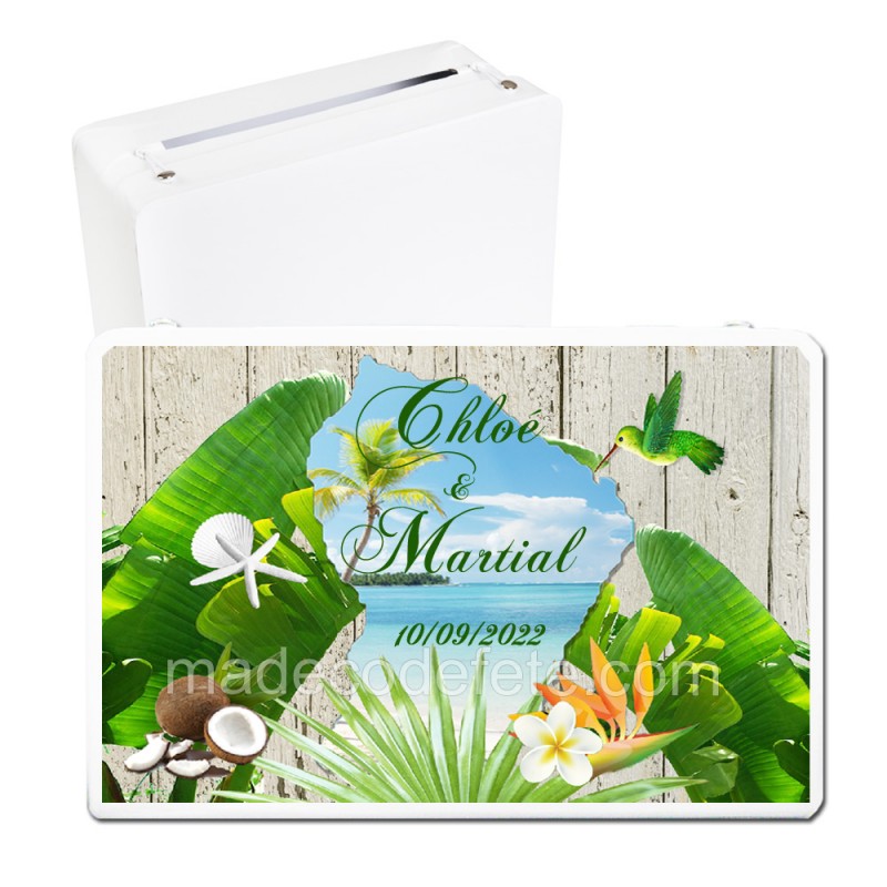 Cette tirelire mariage exotique avec motifs carte de la Guyane sur fond bois, feuille de bananier, noix de coco, sera parfaite posée sur votre table à côté de votre livre d'or. Cette urne convient pour un mariage ou tout événement d'une cinquantaine de personnes environ.