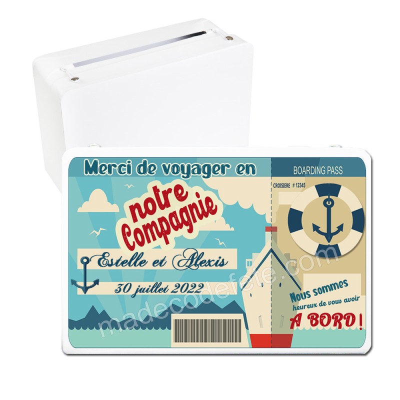 Cette urne tirelire thème voyage et croisière avec ses motifs marins sera parfaite pour votre mariage thème de la mer et du voyage en croisière. Une maquette est adressée par mail pour validation ou modification si besoin.